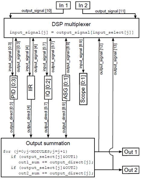 Similarly, a second, possibly different output is allowed for each module (except for scope and trigger): output_direct. This output is added to the analog output 1 and/or 2 depending on the value of the register output_select.