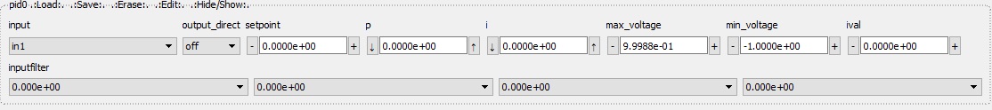 Proportional/Integrator/Differential feedback modules (In the current version, the differential gain is disabled). The gain of each parameter can be set independently and each module is also equiped with a 4th order linear filter (applied before the PID correction) |