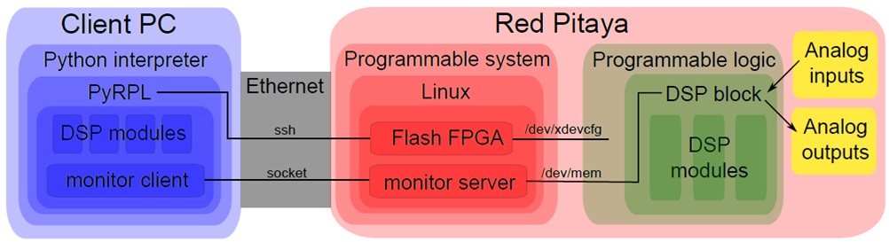The FPGA functionalities of PyRPL are organized in various DSP modules. These modules can be configured and arbitrarily connected together using a python package running on a client computer. This design offers a lot of flexibility in the design and control of various experimental setups without having to recompile the FPGA code each time a different fonctionality is needed. A fast ethernet interface maps all FPGA registers to Python variables. The read/write time is around 250 microseconds for a typical LAN connection. High-level functionalities are achieved by performing successive operations on the FPGA registers using the Python API. A Graphical User Interface is also provided to easily visualize and modify the different FPGA registers. We provide a description of the different software components below.