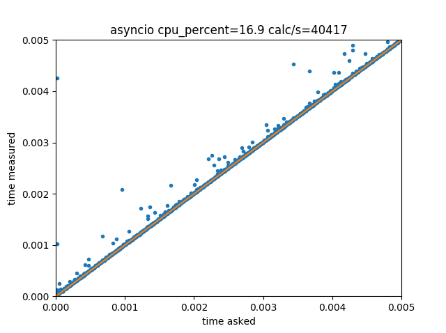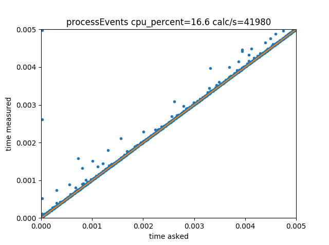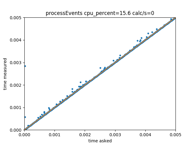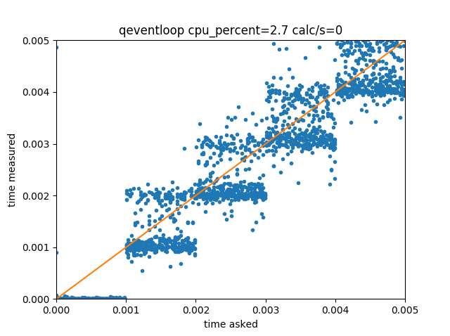 We get, as expected, an almost perfect correlation between requested delays and obtained delays. Some outliers probably result from the OS interrupting the current process execution, or even other events from the GUI loop being executed just before the requested time.