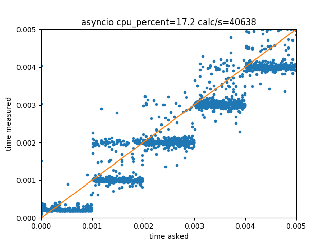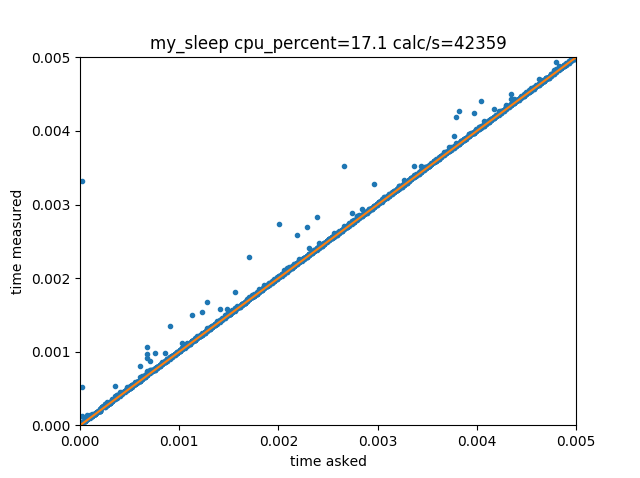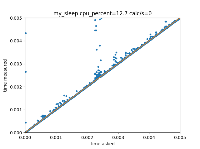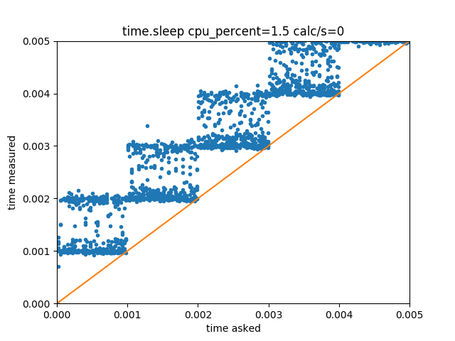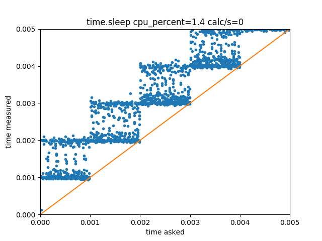 Calling time.sleep(delays) with delays ranging continuously from 0 to 5 ms gives the following distribution of measured delay vs requested delay:
