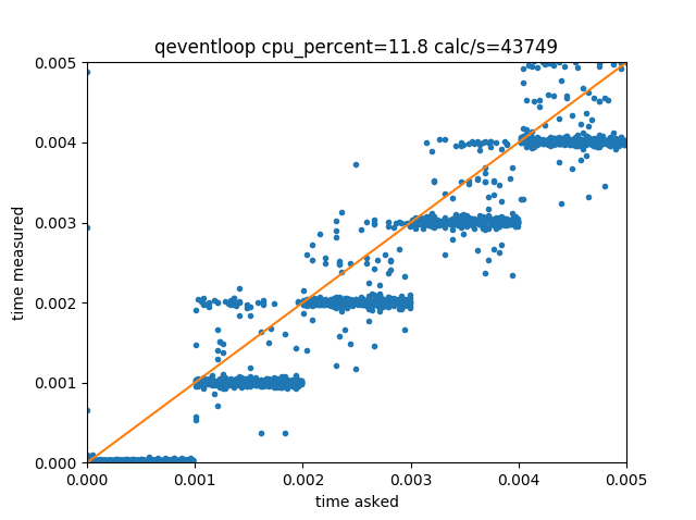 The subtlety here is that the loop.exec() function is blocking, and usully would never return. To force it to return after some time delay, we simply instanciate a QTimer and connect its timeout signal to the quit function of the loop. The timer’s event is actually handled by the loop itself. We then get a much smaller CPU load, however, we go back to the situation where the intervals are only precise at the nearest millisecond.