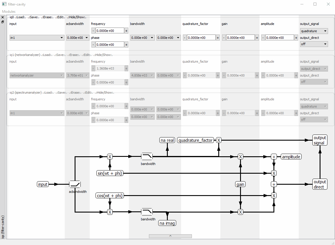 The iq widget is represented in the image below. A schematic of the internal connection of the IQ-module can be shown or hidden with the arrow button.