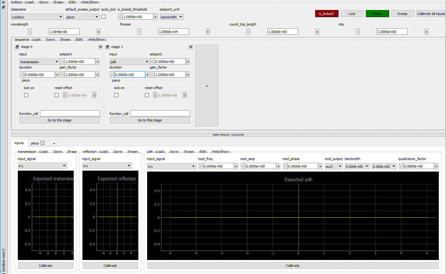 General controls: “classname” selects a particular Lockbox class from the ones defined in lockbox/models folder, and will determine the overall behaviour of the lockbox. “Calibrate all inputs” performs a sweep and uses acquired data to calibrate parameters relevant for the selected Lockbox class. Before attempting to lock, it’s recommendable, and sometimes even mandatory, to press this button.
