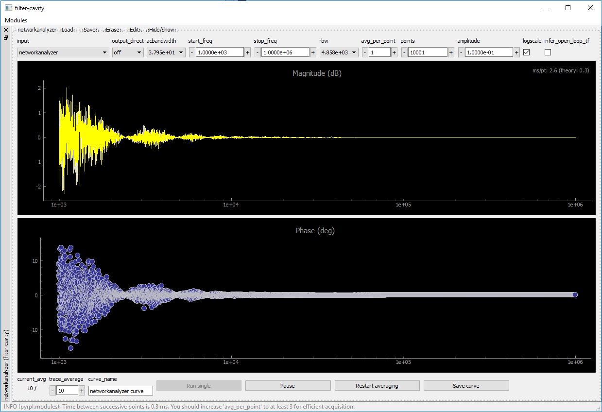 amplitudesets the amplitude of the sinusoidal excitation in Volts.start_freq/stop_freqdefine the frequency range over which a transfer function is recorded. Swapping the values ofstart_freqandstop_freqreverses the direction of the frequency sweep. Settingstop_freq = start_freqenables the “zero-span” mode, where the coherent response at a constant frequency is recorded as a function of time.pointsdefines the number of frequency points in the recorded transfer function.rbwis the cutoff frequency of the low-pass filter after demodulation. Furthermore, the time :math:` au` spent to record each point is :math:` au =`average_per_point/rbw.average_per_point: Each point is averaged inside the FPGA before being retrieved by the client computer that runs PyRPL. You should increase this parameter or decreaserbwif the communication time between the Red Pitaya and the client computer limits the acquisition speed.acbandwidthis the cutoff frequency of a high-pass filter applied to the input before demodulation. A setting of zero disables the high-pass filter.logscaleenables the use of a logarithmic scale for the frequency axis, resulting in a logarithmic distribution of the frequency points as well.infer_open_loop_tfapplies the transformation \(T \rightarrow \frac{T}{1+T}\) to the displayed transfer function to correct for the effect of a closed feedback loop (not implemented at the moment).