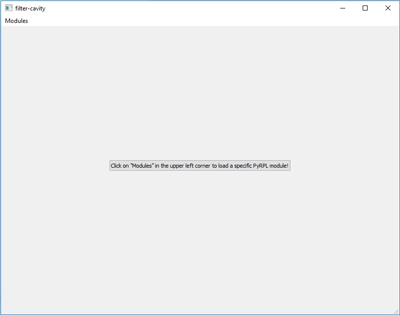 The main pyrpl widget is initially empty, however, you can use the “modules” menu to populate it with module widgets. The module widgets can be closed or reopened at any time, docked/undocked from the main module window by drag-and-drop on their sidebar, and their position on screen will be saved in the config file for the next startup.