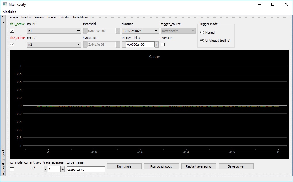 ch1_active/ch2_active: Hide/show the trace corresponding to ch1/ch2.input1/input2: Choose the input among a list of possible signals. Internal signals can be referenced by their symbolic name e.g.lockbox.outputs.output1.threshold: The voltage threshold for the scope trigger.hysteresis: Hysteresis for the scope trigger, i.e. the scope input signal must exceed thethresholdvalue by more than the hysteresis value to generate a trigger event.duration: The full duration of the scope trace to acquire, in units of seconds.trigger_delay: The delay beteween trigger event and the center of the trace.trigger_source: The channel to use as trigger input.average: Enables “averaging” a.k.a. “high-resolution” mode, which averages all data samples acquired at the full sampling rate between two successive points of the trace. If disabled, only a sample of the full-rate signal is shown as the trace. The averaging mode corresponds to a moving-average filter with a cutoff frequency ofsampling_time\(^{-1} = 2^{14}/\mathrm{duration}\) in units of Hz.xy_mode: If selected, channel 2 is plotted as a function of channel 1 (instead of channels 1 and 2 as a function of time).Trigger mode(internally represented byrolling_mode):Normalis used for triggered acquisition.Untriggered (rolling)is used for continuous acquisition without requiring a trigger signal, where the traces “roll” through the plotting area from right to left in real-time. The rolling mode does not allow for trace averaging nor durations below 0.1 s.