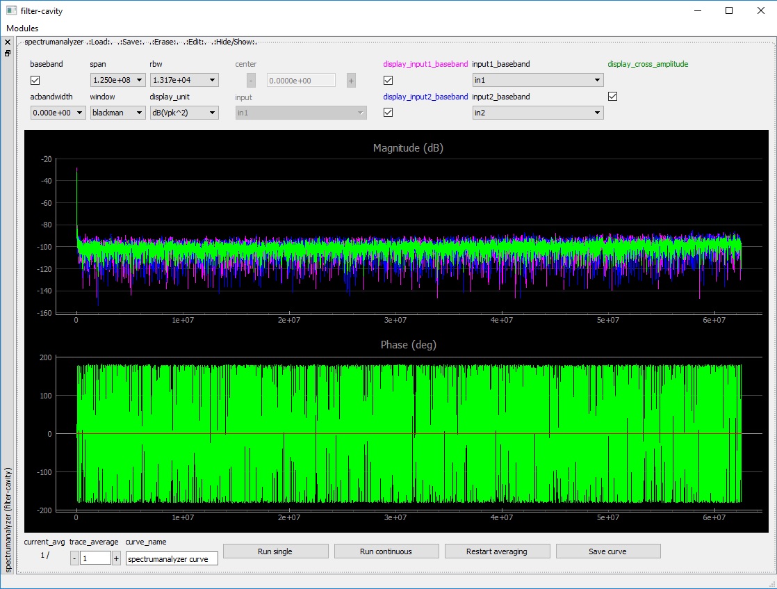 span: The span of frequencies over which a spectrum is acquired. In baseband mode, the actual span is half of this value (because no additional information is given in half-spectrum with negative frequencies).rbw: Resolution bandwidth of the spectrum to acquire (spanandbandwidthare linked and cannot be set independently).display_unit: The unit in which the spectrum is plotted on the screen. Internally, e.g. in saved measurements, all spectra are represented in units of \(\mathrm{V}_\mathrm{pk}^2\).window: The type of window used for the Fourier transform. See scipy.signal.get_window for a list of available options.acbandwidth(only available withbaseband=False): The cut-off frequency of the high-pass filter before frequency-shifting (=demodulation) of the input signal.